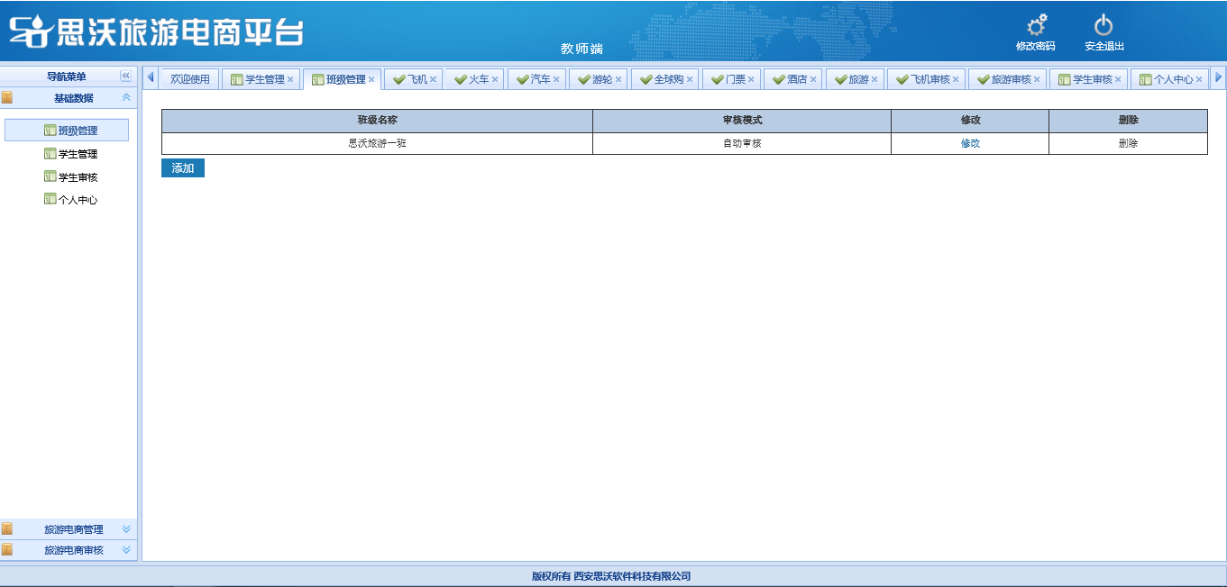 教(jiao)師端包括:基礎數據(班級管理、學生(sheng)管理、學生(sheng)審核(he)、個人信息);旅游(you)(you)電商(shang)(shang)管理(對學生(sheng)發布(bu)已審核(he)的(de)飛(fei)機、火車(che)、汽(qi)車(che)、游(you)(you)輪(lun)、全(quan)球(qiu)(qiu)購(gou)、門(men)票、酒(jiu)店(dian)(dian)、旅游(you)(you)產品(pin)信息進(jin)行管理);旅游(you)(you)電商(shang)(shang)審核(he)(對學生(sheng)發布(bu)的(de)飛(fei)機、火車(che)、汽(qi)車(che)、游(you)(you)輪(lun)、全(quan)球(qiu)(qiu)購(gou)、門(men)票、酒(jiu)店(dian)(dian)、旅游(you)(you)產品(pin)信息進(jin)行進(jin)行審核(he))。
