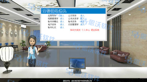 思沃文秘虛(xu)擬仿真實訓系(xi)統是我公司依據文秘專業相關課程,結合(he)3D動態場景技術,引入實際文秘工作中的(de)相關案(an)例,融合(he)開發的(de)一款針對(dui)文秘專業實訓的(de)應用型教學(xue)平臺軟件。